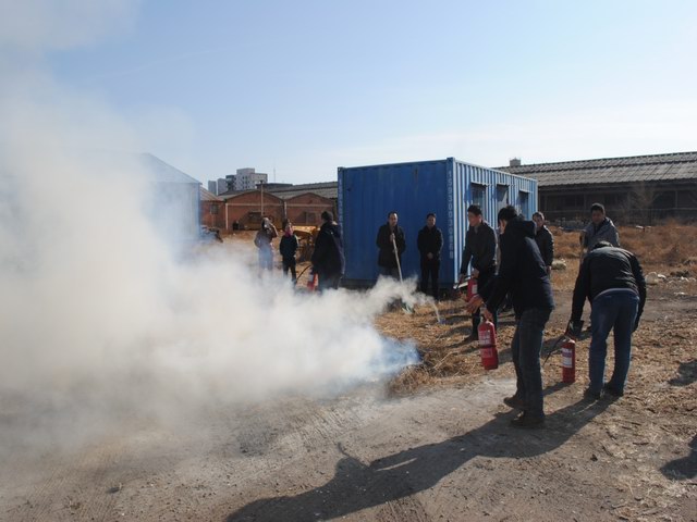 图为员工在演练如何使用灭火气灭火的现场情景。