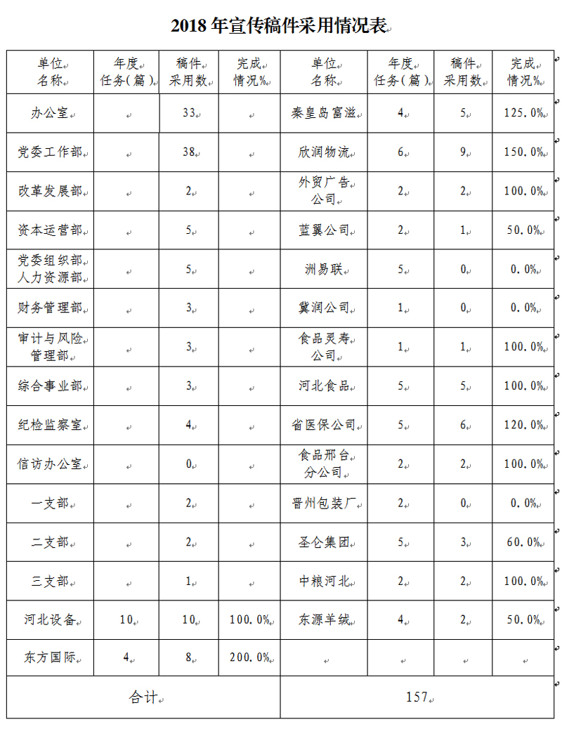 2018年稿件采用情况呈以下特点:一是公司本部占比超过六成今年发布的157篇稿件和信息中,公司本部101篇,占比64.3%。二是公司本部各部室信息发布数量不平衡。发布信息较多的部室有党委工作部(38篇),办公室(33篇),占到公司本部总发布量的约70.3%,其他部室信息发布量在0~5篇之间。三是河北设备、欣润物流、东方国际全年发布信息量较多,占各出资企业总发布量的近50%,上述3家企业及秦皇岛富滋、外贸广告、灵寿公司、河北食品、省医保公司、邢台分公司、中粮河北共计10家企业均完成或超额完成了全年目标篇数。