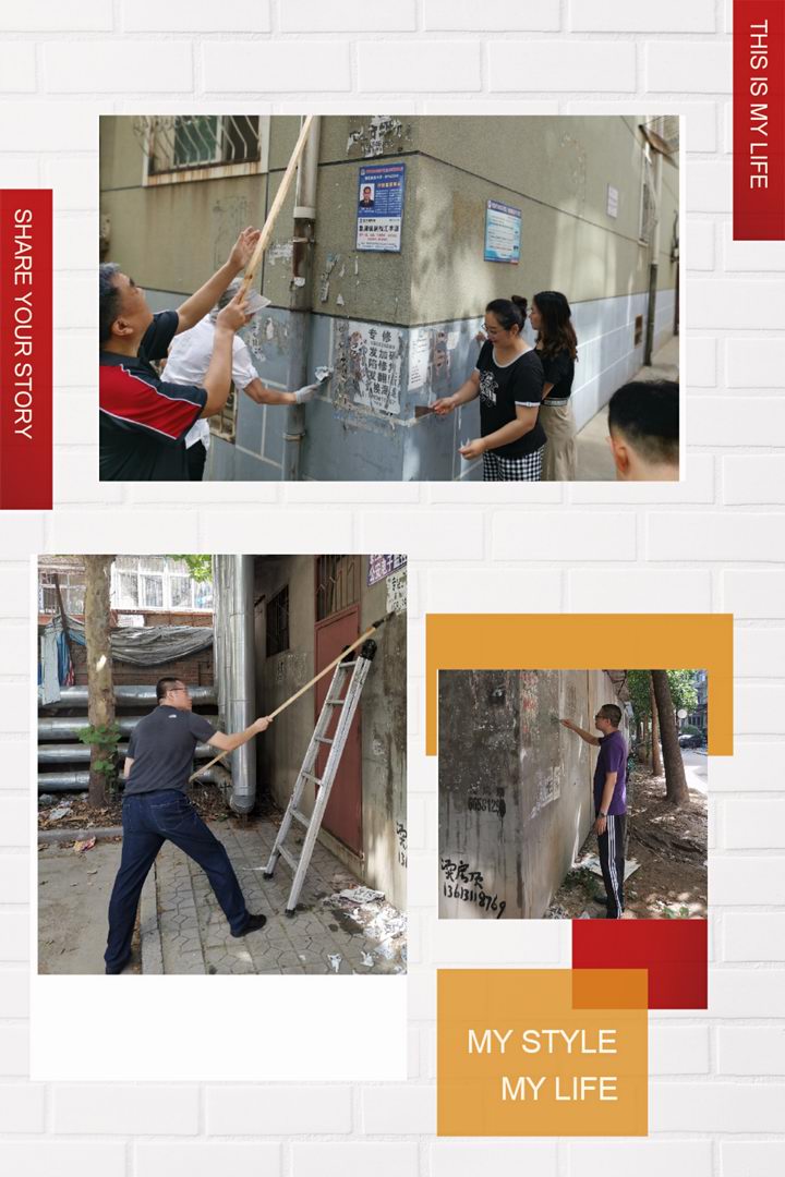 女同志们发挥优势耐心细致处理低处的小广告,男同志们登高爬梯汗流浃背,沙子蹦到眼里、涂料溅到身上毫无怨言。