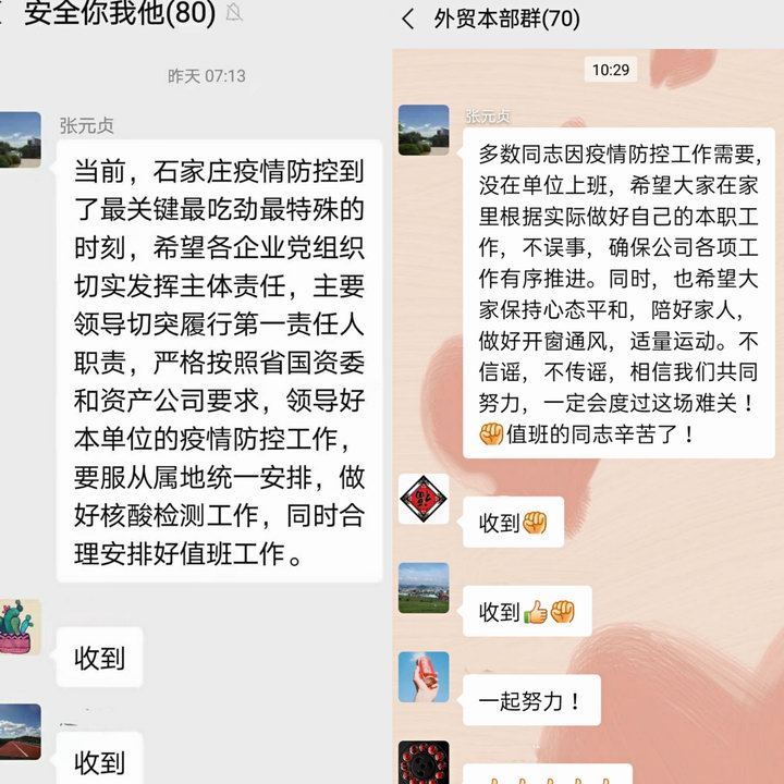 实时联动, 宣传引导到位。公司密切关注与新冠肺炎疫情相关的舆情动态,加大宣传力度。公司通过微信公众号、微信群等,发送疫情动态、防控知识、核酸检测注意事项等,引导干部职工积极配合社区防控要求,做到科学有效防控、减少恐慌。各企业、各部室严格落实疫情防控日报告制度,及时报送疫情防控动态和核酸检测进展情况,确保信息传送及时、准确。在启动全员核酸检测后,张元贞书记多次在公司系统安全群、公司总部群要求干部职工严格按照上级和公司要求,做好疫情防控,合理安排值班值守工作,根据实际做好居家办公,确保公司各项工作有序推进,并鼓励大家保持心态平和,做好开窗通风,适量运动,不信谣,不传谣,齐心协力,共渡难关。