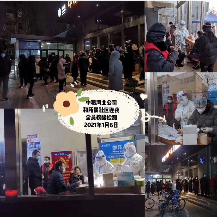 上级要求,制定防控方案,明确防控措施,严格执行特殊情况外出审批备案制度和24小时值班值守制度,毫不松懈抓好佩戴口罩、测温扫码和办公区域消杀工作,全方位无死角切断疫情传播途径。公司总部值班值守人员坚持24小时坚守工作岗位,做好应急事务处理。各驻石企业严格按照上级安排部署落实疫情防控要求,积极配合街道和社区做好核酸检测工作,严格执行疫情防控、核酸检测日报告制度。在落实防控要求的基础上,公司总部和东方国际值守人员协助配合辖区组织完成对飞翼路8号院住户及值守员工等近500人的核酸检测工作;中粮河北和所属社区连夜组织全员核酸检测工作。