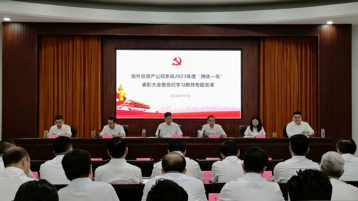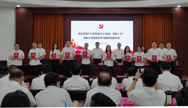 为庆祝中国共产党成立103周年,进一步激励公司系统各级党组织和广大党员继承和发扬党的光荣传统,增强党性意识,凝聚发展力量,2024年7月1日,省外贸资产公司举办“两优一先”表彰大会暨党纪学习教育专题党课。公司领导,各企业党组织书记、党务分管领导,总部各部室主要负责人、党支部书记,受表彰人员共计50人参加会议。会议由党委副书记齐山水同志主持。
